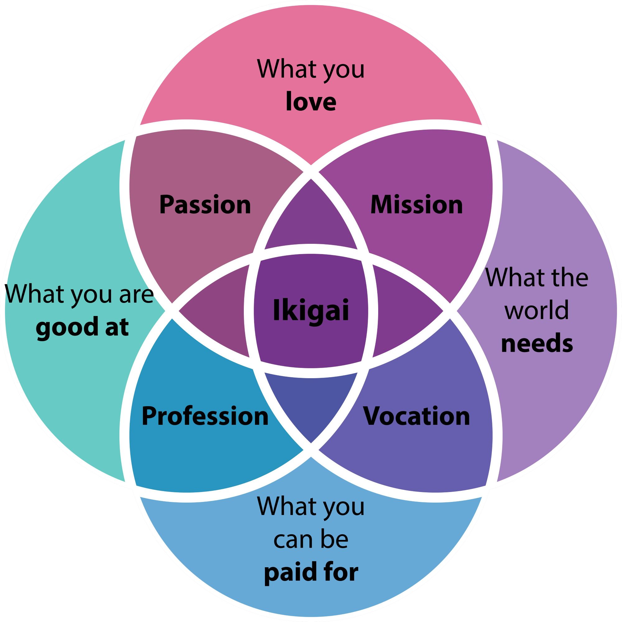 Ikigai employs four criteria for selection of your occupation that when aligned create a synergy that will amplify your achievement, happiness, and have a positive impact on the world.