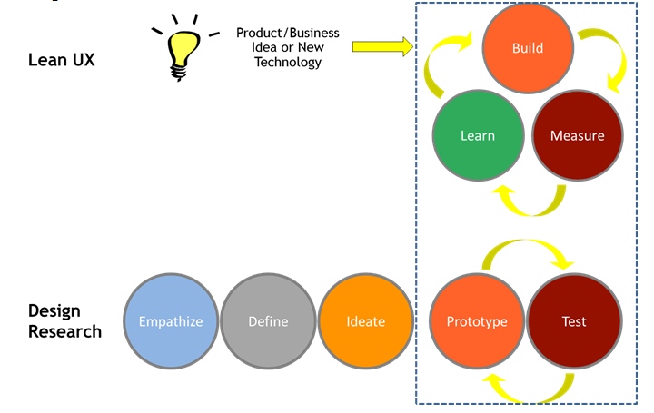 Both Lean UX and Design Research share the process of using customer feedback to validate and refine new product and business ideas. However, the Design Research process has the advantage of using customer input even at the idea conception stage. Doing so makes the process of refinement to find product-market fit much faster. However, these two processes are not mutually exclusive. This diagram shows how Design Research can be applied at the front end of innovation to create new concepts and combined with Lean UX in the validation stage: